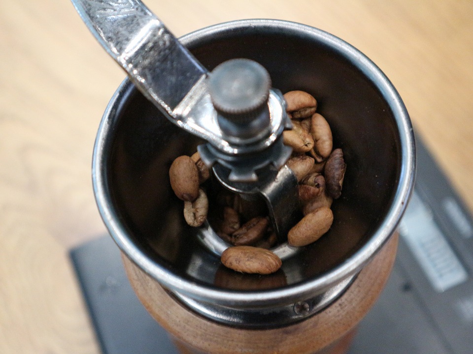 焙煎が終われば、いよいよコーヒーミルの登場です。ゴリゴリという音を聞きながらじっくりとミルを回す行為はとても特別な時間に思え、「あ、ハマりそう」と思わず呟いてしまうのでした。