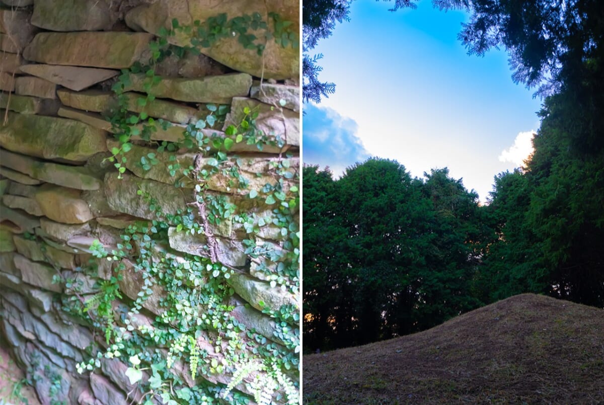 まず、頂点にかけて尖がったようなフォルムにびっくり!これまで3,000基以上の古墳を見てきましたが、この形はかなり珍しい……。石室は切り石を積んでいて、古墳時代前期に主流だった竪穴式石室から横穴式石室へと切り替わる時代に見られる造りで、時代の過渡期を感じられる古墳です。