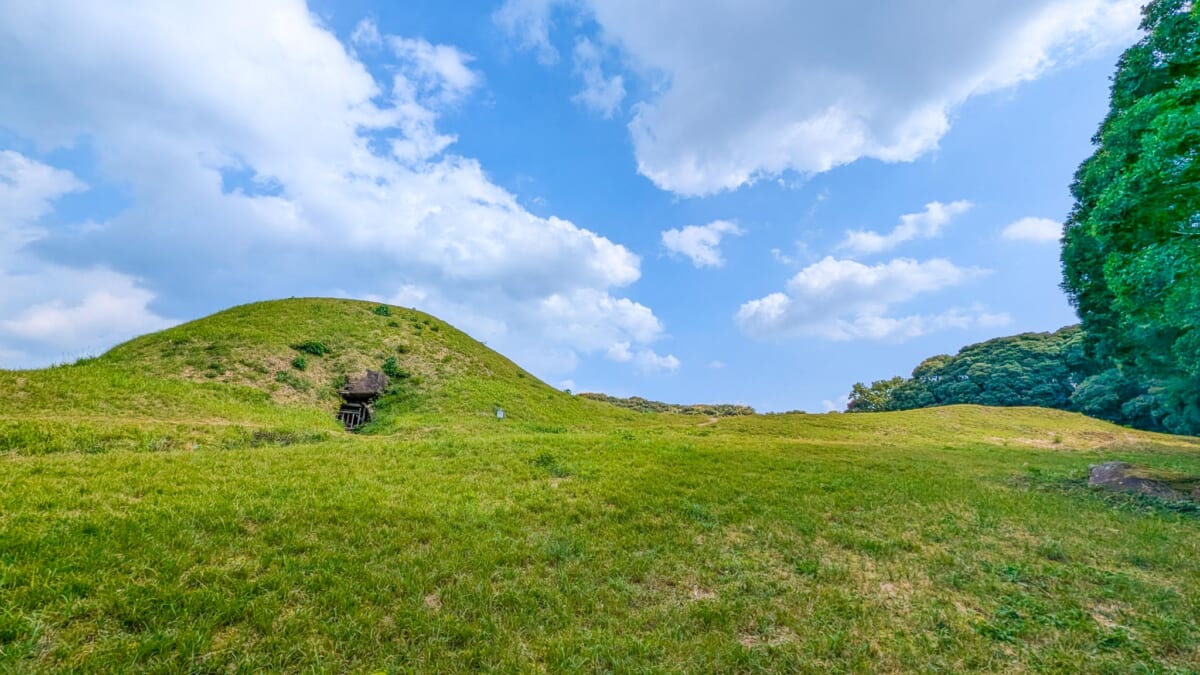 5世紀ごろに築造されたとされる島内最古級の「大塚山古墳」。シュッとしたフォルムが特長的で、前方後円墳しか知らなかった古墳ビギナーな筆者は、思わず「すごい……」とつぶやいてしまうほどのかっこよさ。