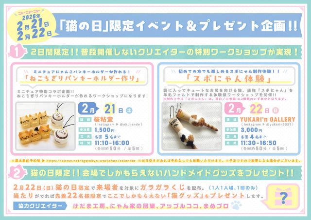 2026年2月22日(日)猫の日にちなみ、2日間限定で特別なワークショップを開催。普段はワークショップを行わないクリエイターが集結し、この日のために特別な内容を用意してくれました。