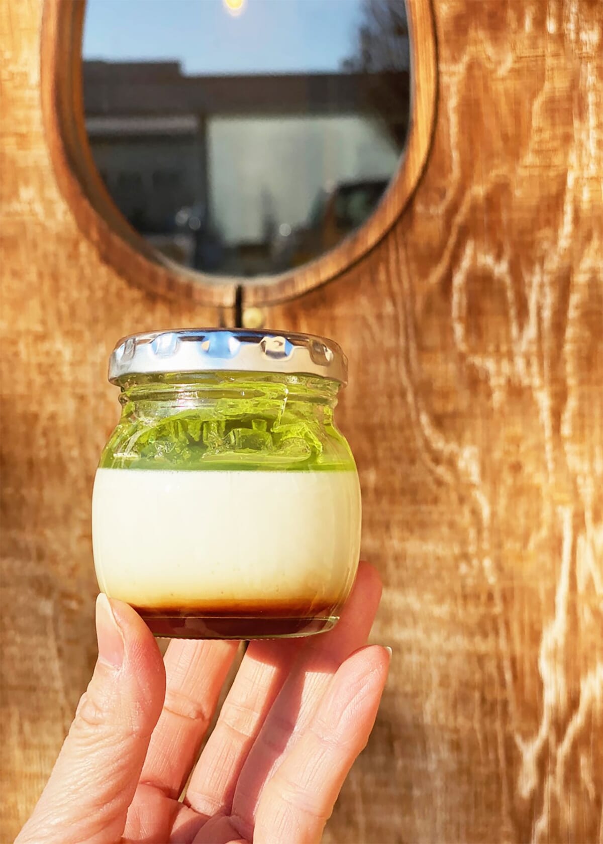 夏のアルプスをイメージしたプリンです。白いミルクプリンの上に、山辺ワイナリーの松本産「ナイヤガラワイン」を使った、香り高いワインジュレをのせました。蓋を開けると、美しいグリーンがアルプスの山々を思わせるプリンゼリーです。