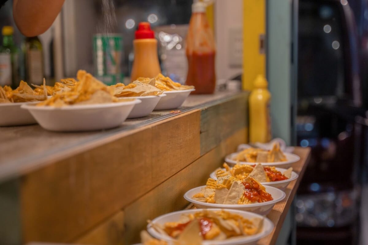 さまざまなキッチンカーで腹ごしらえを。飲み放題のドリンクやお酒のお供を選んでください。