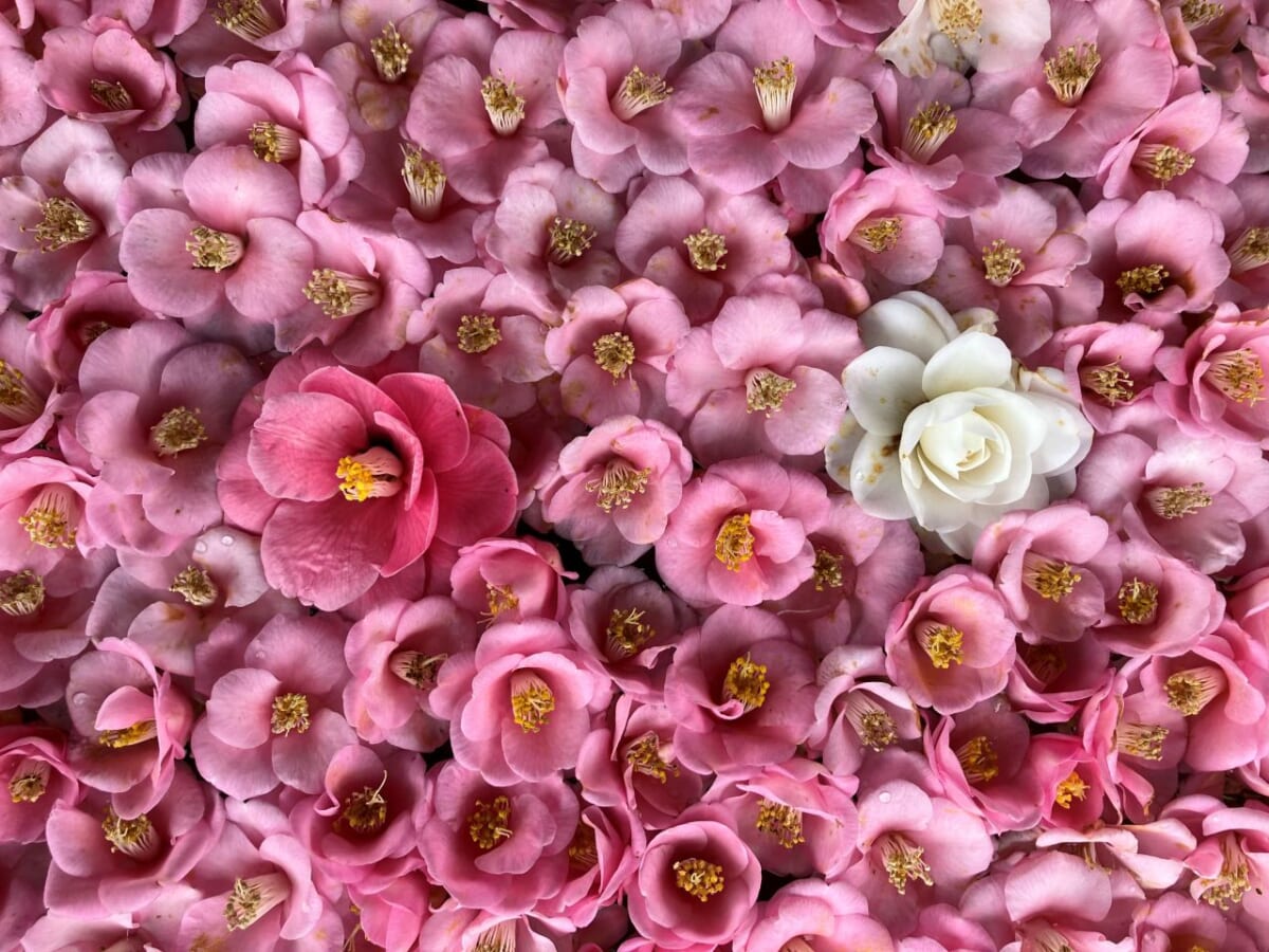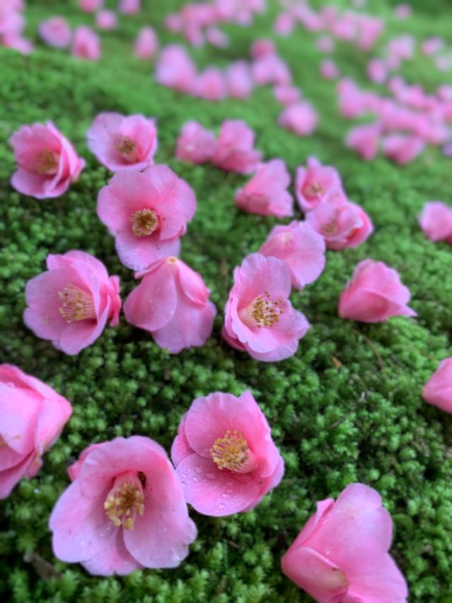開花中はもちろん、苔の上にぽとりと花が落ちる姿や散椿の花びらが地面に散り積もる様子は、儚くも散ったあとまでも楽しませてくれる椿の魅力でもあります。