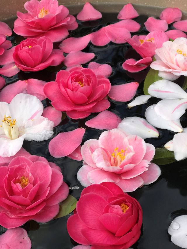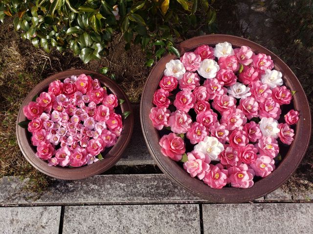 庭園内の小さな手水鉢に浮かんだ椿の美しさには目が奪われます。