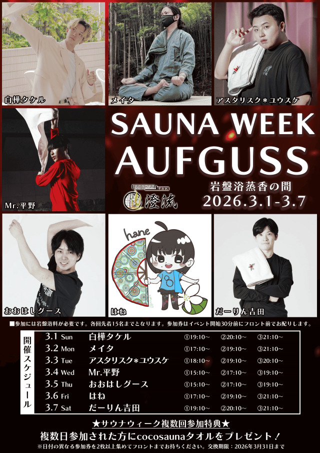 ※期間中にアウフグースを2日間以上利用すると「cocosaunaタオル」をプレゼント(数量限定)。