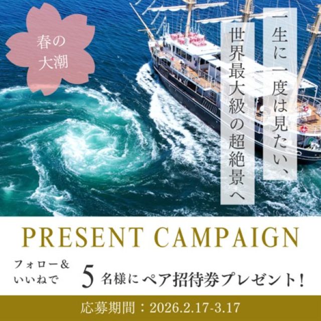 “渦潮の旬”を多くの方に知ってもらい、淡路島の自然の神秘を体感するきっかけにと、今回のキャンペーンが実現。公式Instagramにフォロー&いいねするだけで、「うずしおクルーズ」ペア乗船招待券が当たるチャンスです!