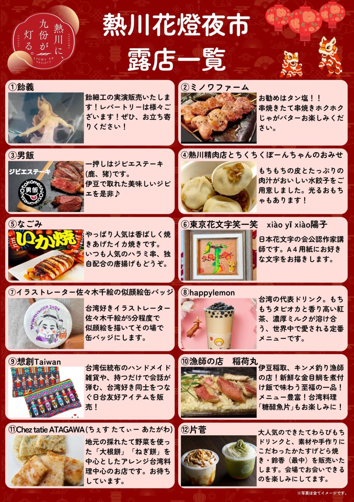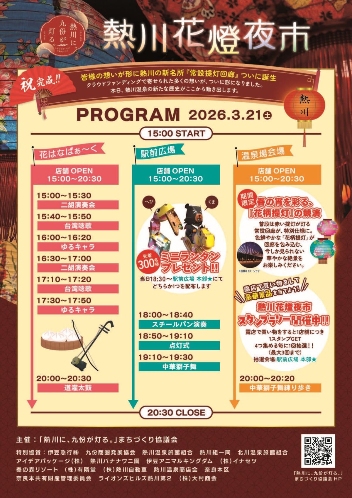 静岡県東伊豆町の熱川温泉では、2026年3月21日(土)に「熱川に、九份が灯る。」と題した、台湾・九份(きゅうふん)との交流を背景としたイベント「熱川花燈夜市(あたがわかとうよいち)」を開催! 地元飲食店に加え、台湾グルメや台湾雑貨の販売など約25店舗が集結します。また、クラウドファンディングで実現した熱川温泉の新名所「常設提灯回廊」の完成お披露目も。温泉街が春限定の“花柄提灯”に彩られ、台湾文化に包まれる特別な夜市を楽しみませんか?