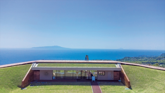 小室山の山頂には、絶景を楽しめる「小室山リッジウォーク“MISORA”」が広がります。相模灘や伊豆諸島、そして天候次第では富士山まで一望できる開放的なロケーションが魅力。併設の「Cafe・321」は全席オーシャン&スカイビューで、地層をイメージした落ち着いた空間やウッドデッキでゆったりと過ごせます。