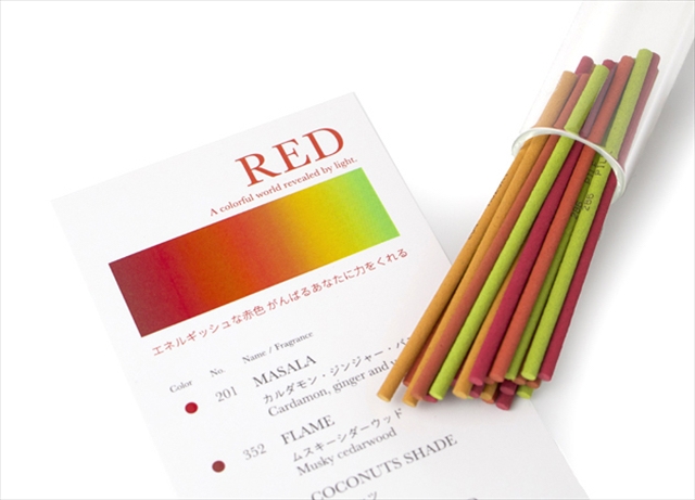 今回のPOP UP SHOPでは、RED・YELLOW・GREEN・BLUE・PURPLEの5色をテーマにした数量限定のアソートメントが登場。それぞれのカラーに合わせてセレクトされた6種・計30本のインセンスを、ガラスケースに収めた特別仕様です。