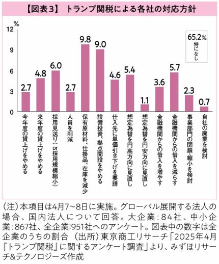 このように、トランプ関税は企業業績に悪影響をもたらす公算が大きい。【図表2と3】は東京商工リサーチが4月上旬に行った日系企業へのアンケート結果である。トランプ関税による企業業績への影響を問われる質問(図表2、回答期間:4月1〜8日)に対しては、半数以上となる52・4%の企業が「マイナスの影響がある」と回答している。46•2%の企業は「影響なし」、と回答しているが、「よく分からない」「精査中」といった企業も「影響なし」と回答している可能性があるほか、相互関税公表前に回答した企業も一部あるとみられ、今後マイナスの影響があると回答する企業の比率が高まる可能性がある。特に、業種別では、マイナス影響があると回答した割合が最も高いのは製造業(64・5%)。次いで、卸売業(56・5%)、運輸業(51・5%)が続き、輸出関連や流通を担う産業を中心に、幅広い産業への影響の広がりが示唆される。日系企業各社の対応(図表3、回答期間:4月7〜8日)について、現時点で「特になし」(自社への影響を精査中)の企業が65・2%と多いが、既に対応が具体化している企業では「保有原材料、仕掛品、在庫の縮小」(9・8%)、「設備投資・拠点開設の取りやめ(縮小)」(9%)の回答割合が相対的に高く、一部で賃上げや採用を控える動きもある。加えて、仕入れ先への値下げ要請など、サプライチェーン(供給網)全体への影響も懸念される結果となっている。
