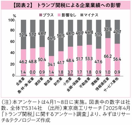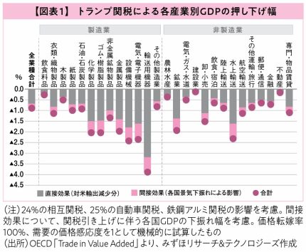 【図表1】は、相互関税(24%の場合)と自動車関税(25%)、鉄鋼・アルミ関税(25%)によって、日本の各産業のGDPがどの程度押し下げられるかを示しており、全体感としては、日本のGDPを0・9%押し下げる計算となる。そのうち0・65%が直接効果、0・23%が間接効果となる。すなわち、関税率引き上げによって米国の物価が上昇し、買い控えが起こることによる影響が大部分を占めることが示唆される。同様の傾向が業種別に見ても示唆される。