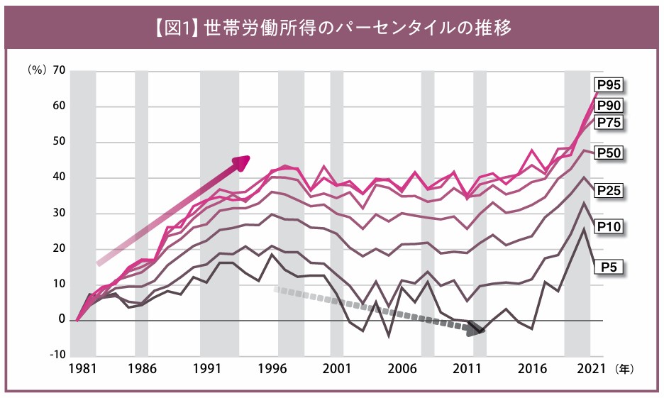 下位のP5の位置にいる世帯の所得水準は、2000年代に1981年の水準を下回ってしまった。P10、P25といった下位層でも所得水準の低下が観察されている。上位P75、P90、P95といった層の所得は横ばいで推移しているが、下位層の所得が低下したために差が広がったことが確認できる。